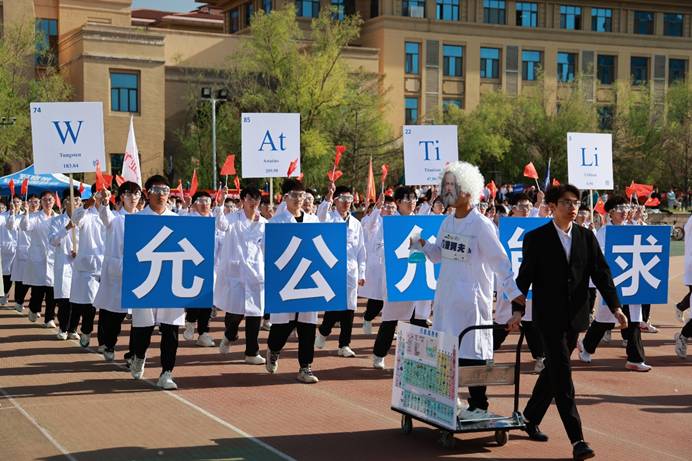 开幕式上,365英国官网学生方阵以创新编排展现化学化工之美。同学们化身门捷列夫、诺贝尔等科学家齐聚亮相,“W”“At”“Ti”“Li”等元素立牌随韵律起伏,队列如分子链般整齐律动。青春活力与严谨学术交相辉映,尽展365英国官网师生蓬勃朝气与学科魅力。