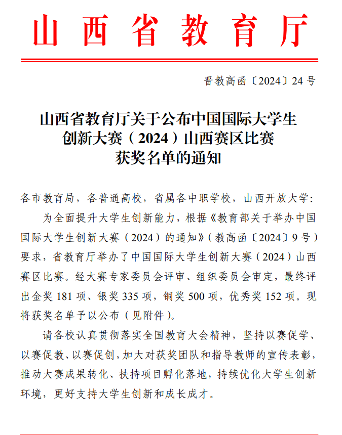 近日,山西省教育厅公布了中国国际大学生创新大赛(2024)山西赛区比赛获奖名单,365英国官网师生在众多参赛队伍中脱颖而出,喜获佳绩。
